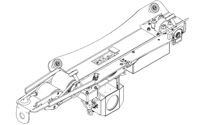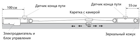 крепится к потолку объекта. Внутри перемещается каретка с установленным